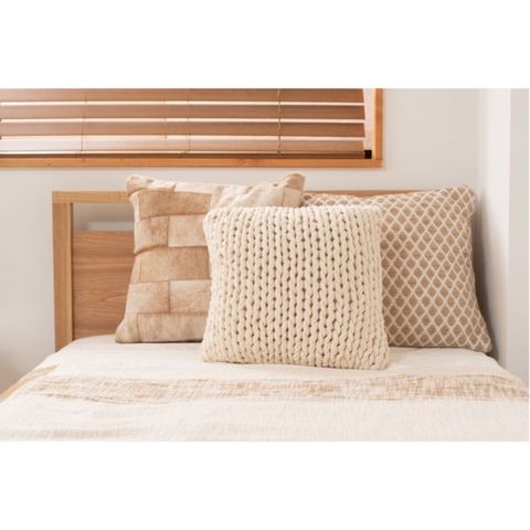 ●それはまるでニットのように。丁寧に編み込まれたカバーリングが印象的なクッション。