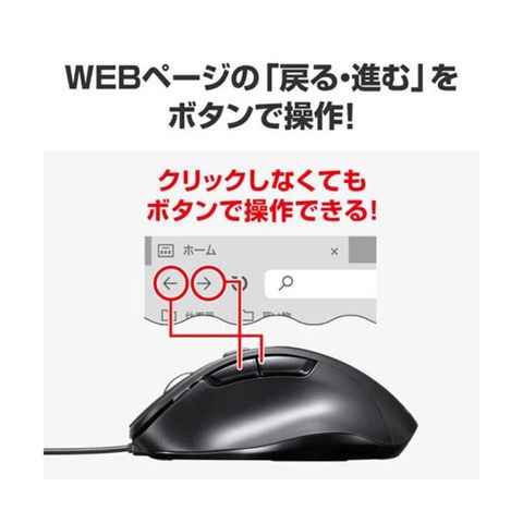 ●マウスポインタを動かさず手元のサイドボタンで操作できる「戻る・進む」の2ボタンを搭載しており、Webブラウザで操作を