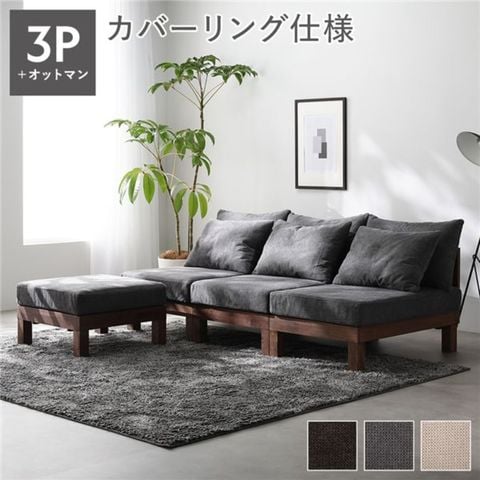 あぐらがかけるソファ セット 3人掛けソファ + オットマン グレー 天然木 脚取り外し可 洗えるカバー家具 お客様組立品 【同梱不可】【代引不可】[▲][TP]