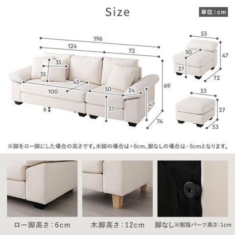 ロー脚6cm:(1)縦105×横76.9×高さ55cm・34.7kg、(2)縦122.6×横55.2×高さ53cm・31.3kg、(3)縦34×横33×高さ15cm・2.5kg