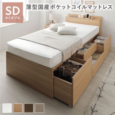 宮付 チェスト ベッド セミダブル ナチュラル 薄型国産ポケットコイルマットレス付 コンセント付 大容量 収納ベッド お客様組立品 【同梱不可】【代引不可】[▲][TP]