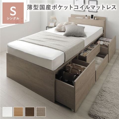 宮付 チェスト ベッド シングル グレージュ 薄型国産ポケットコイルマットレス付 コンセント付 大容量 収納ベッド お客様組立品 【同梱不可】【代引不可】[▲][TP]