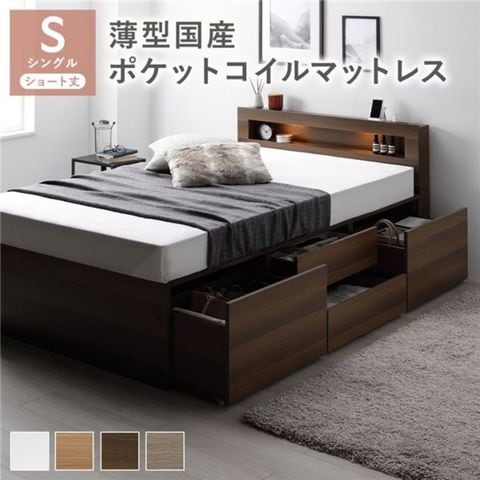 照明宮付 チェスト ベッド ショート丈シングル ブラウン 薄型国産ポケットコイルマットレス付 収納ベッド コンセント付 お客様組立品 【同梱不可】【代引不可】[▲][TP]