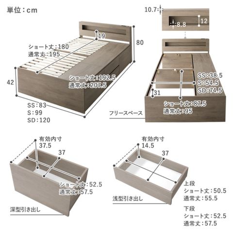LED照明:ショート丈セミシングル/ショート丈シングル/シングル×1、セミダブル×2