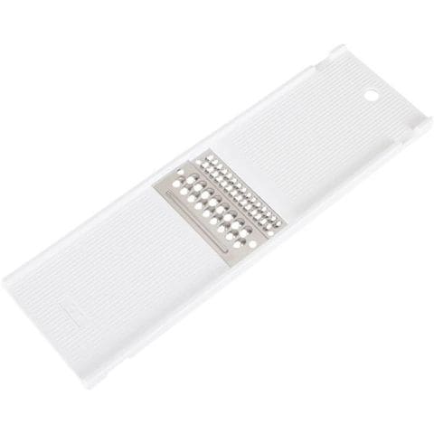 両面で違う太さの千切りができるスライサータイプの千切り器。約4mmの千切りと約2mmのツマ切りの2種類の切り方が可能。大根サラダやにんじんしりしり、紅白なますなどの下ごしらえに。