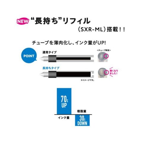 ●よく使う黒インクは後端ノックで直感的に繰り出せる。インク増量の長持ちリフィル搭載で「黒」が長く使える。