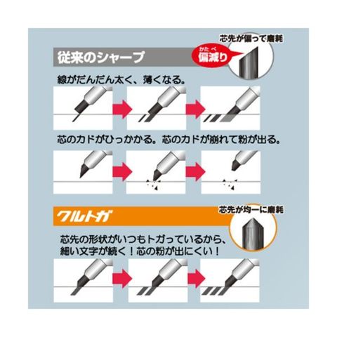 ●クルっと回ってトガった芯をキープ、芯先の形状がいつもトガっているから、細い文字が続きます。また、芯の粉が出にくいです。