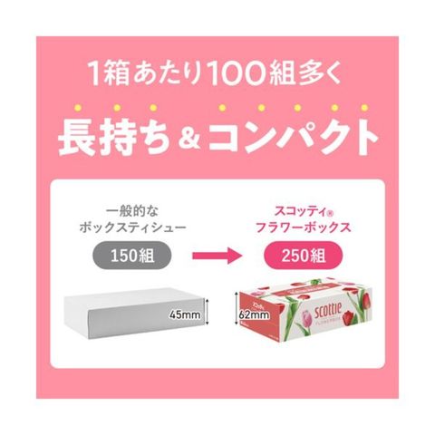 ※一般的なボックスティシュー150組5箱とスコッティフラワーボックス250組3箱との比較