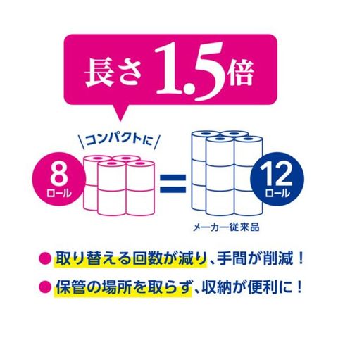 8ロールで12ロール分の長さの長持ちトイレットペーパー