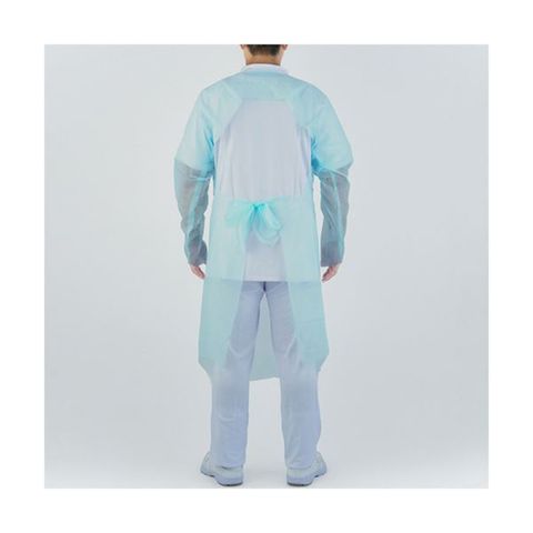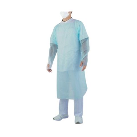 防水性が高い使い捨てプラスチックガウン。エンボス加工でまとわりつきにくく、手首の露出を防ぐ親指フックタイプ。