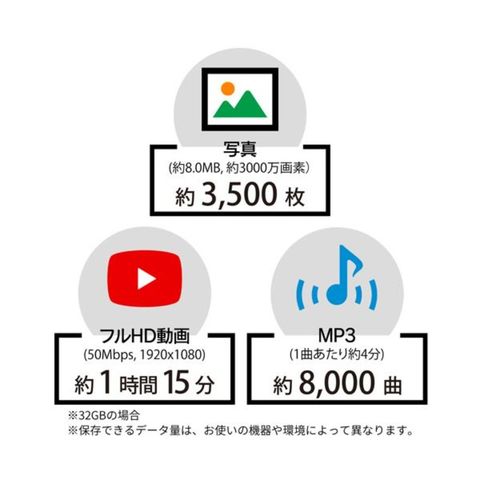 備考:※ドライブレコーダー、監視カメラ、4K動画、連写撮影などには対応していません。