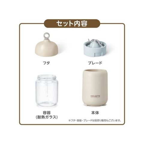●付属品は本体・容器・ブレード・フタのみ。アタッチメントを付け替えたりする必要もありません。容器はそのまま保存にも使えるので、洗い物が少ないのも嬉しいポイントです。