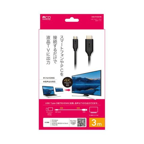 ナカバヤシ ミヨシ Type-C to HDMIケーブル 3m ブラック USD-FH30/BK 1本 【同梱不可】【代引不可】[▲][TP]