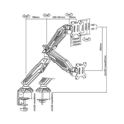●取付けたモニターを360°回転させたり、左右パン方向に180°、上下チルト方向に上90°下45°まで角度をつけられるので、モニターを様々な角度に調節できます。