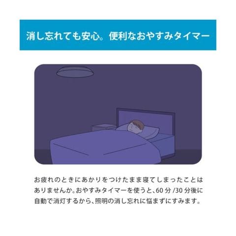 ●あかりを点けたまま眠っても自動で消灯。スリープタイマーを使うと、60分/30分後に自動で消灯するため、照明の消し忘れに悩まずにすみます。