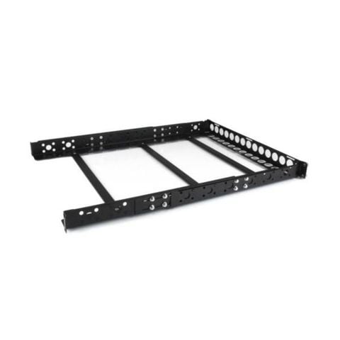 ●3本のクロスバーを使用するオープンフレームで装置を支え、ラックマウント非対応の装置にラックマウント機能を持たせます。レールをサーバーラックに取り付け、装置をアンダーキャリッジに置いてラックマウント非対応装置をマウントします。マウント穴がついている装置の場合は、レールに開けてある複数パターンのマウント穴を使用して装置を固定し、さらに安定性を高めることができます。