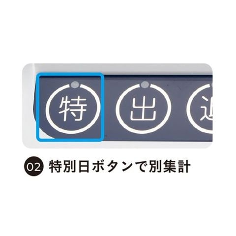 機能:万年カレンダー、カード表裏判定、カード自動引込、セキュリティ機能、徹夜勤務対応、特日ボタン、集計機能(社員モード/パートモード)、締日設定、時刻同期、出退状況確認、複数台管理、打刻データ出力、時刻改ざんアラー、電波時計