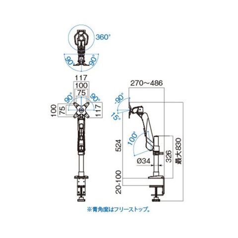 ●任意の位置でフリーストップ。上下角度調整、100度左右首振り、左右180度