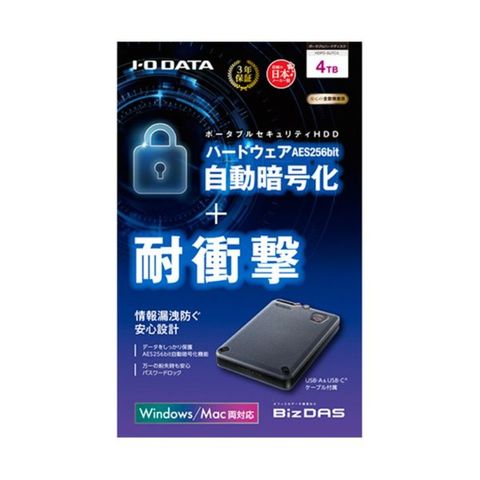 アイオーデータ 5Gbps(USB3.2 Gen1) ハードウェア暗号化&耐衝撃ポータブルHDD 4TB HDPD-SUTC4 1台 【同梱不可】【代引不可】[▲][TP]