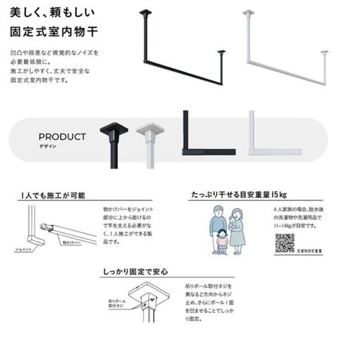 ●凹凸や段差など視覚的なノイズを必要最低限にし、施工がしやすく、丈夫で安全な固定式室内物干です。