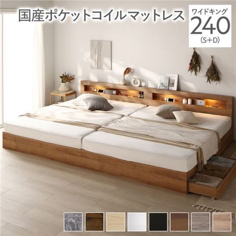 ベッド ワイドキング 240(S+D) 国産ポケットコイルマットレス付(レギュラー) ナチュラル(シャビー) 照明付 収納付 宮付 連結 組立品 【同梱不可】【代引不可】[▲][TP]