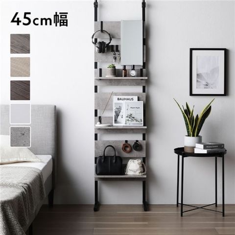 突っ張り ウォールラック 〔 45cm幅 ストーン×ブラック 〕 ミラー付き 壁面収納 棚 賃貸OK お客様組立品 インテリア 【同梱不可】【代引不可】[▲][TP]