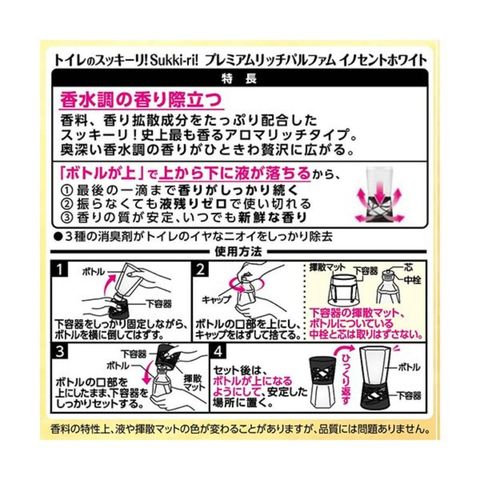 ●香料、香り拡散成分をたっぷり配合したスッキーリ!アロマリッチタイプ。高級な香水をイメージした、気分が落ちつくような、気品のあるホワイトフローラルムスクの香りです。