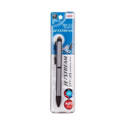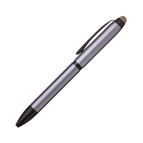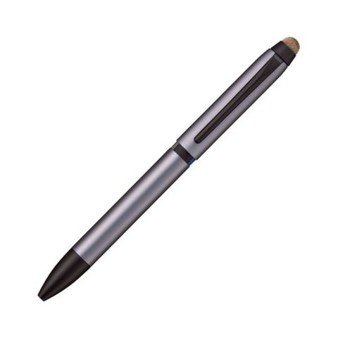 ●独自開発・軽いタッチでなめらかに操作できる「タッチペン」を搭載した3色ボールペン、軸色はシルバーです。