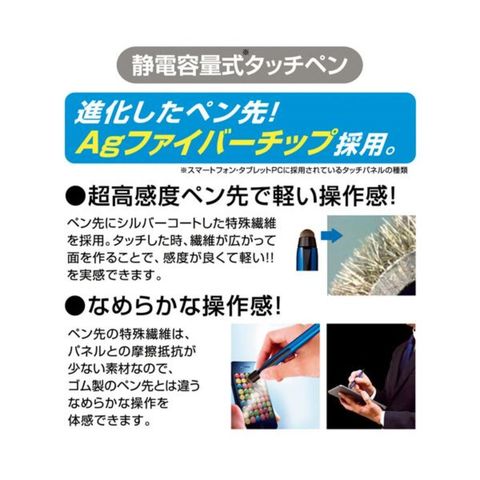 ●静電容量式タッチペンは画面に軽く触れるだけでスムーズに操作可能。シルバーコートの繊維が広がり、感度がアップ。ゴム製のペン先とは違うなめらかな操作を体感できます。