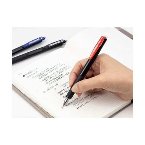 ●ペン先は金属製、筆記を安定させる低重心、細かく書いても紙面が視認しやすい形状です。