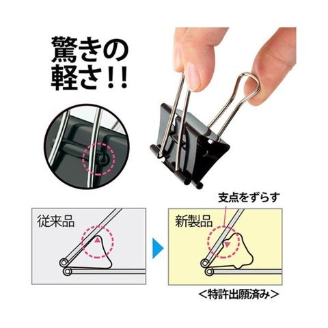 ●本体部分に突起をつくり支点の位置をずらし、さらにレバーの長さを伸ばすことで、軽い力で簡単にクリップを開くことができます。