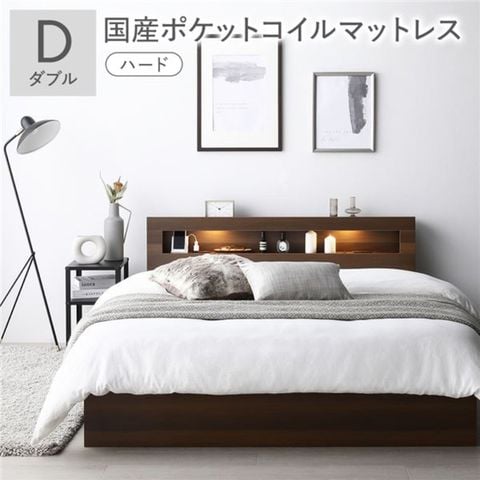 ベッド ダブル 国産ポケットコイルマットレス付 ハード ブラウン 照明 宮付 収納ベッド 【同梱不可】【代引不可】[▲][TP]