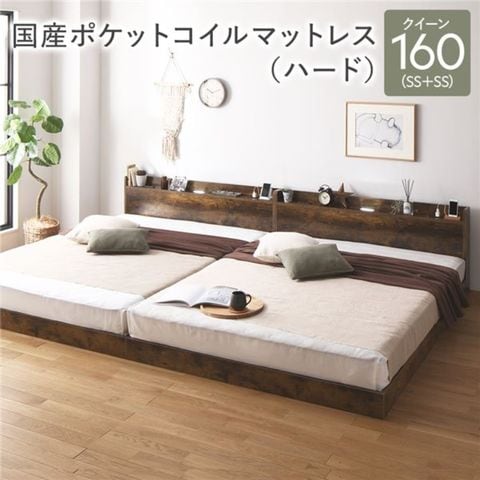 ベッド クイーン 160 (SS+SS) 国産ポケットコイルマットレス付き ハード ヴィンテージブラウン 連結 すのこ 宮付 ローベッド 【同梱不可】【代引不可】[▲][TP]