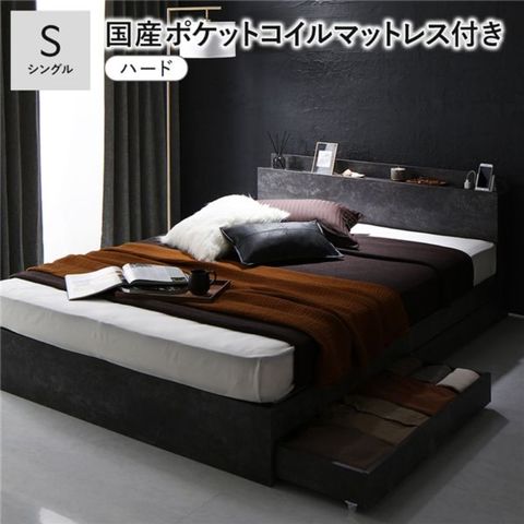ベッド シングル 国産ポケットコイルマットレス付 ハード ストーングレー キャスター付 引出し収納 宮付 収納ベッド 【同梱不可】【代引不可】[▲][TP]