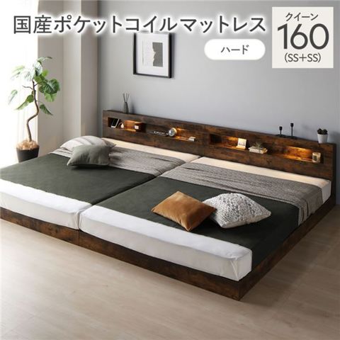 ベッド クイーン 160 SS+SS 国産ポケットコイルマットレス付 ハード ヴィンテージブラウン 連結 低床 照明 宮付 すのこ 【同梱不可】【代引不可】[▲][TP]