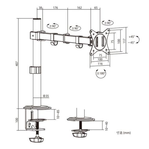 ■可動範囲:垂直+45°/‐45°、水平+90°/‐90°、回転+180°/‐180°
