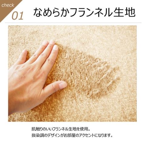 なめらかな肌触りが気持ちいいフランネル調ラグ。やわらかい毛足と抜染によるデザインがお部屋を上品な印象に。毛足が短めでオールシーズン使える万能ラグです。汚れても洗濯機で丸洗いできるので、いつでも清潔にお使いいただけます。ラグの裏面はフェルト状(不織布)だから、床を傷付けにくく、賃貸やアパート暮らしの方でも安心してお使いいただけます。