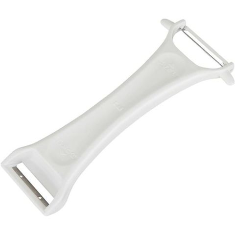 ストレート刃とギザ刃の両用タイプのピーラーです。ギザ刃はトマトの薄皮むきや、実の柔らかい桃やキウイなどの皮むきに便利。ストレート刃は、野菜の皮むきができます。じゃがいもの芽取り付。食洗機可能なので、お手入れ簡単です。