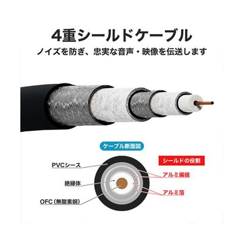アルミ箔とアルミ編組で構成された計4層のシールドが、外来ノイズからケーブルを効果的に保護します。