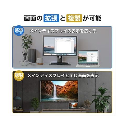 サブディスプレイを追加して画面の表示領域を広げる拡張モードと、メインディスプレイと同じ画面を表示する複製モードに対応しています。
