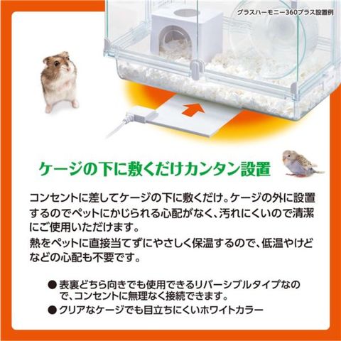 ケージの下に敷くだけで簡単設置!しっかりやさしくあたためるシートヒーターです。