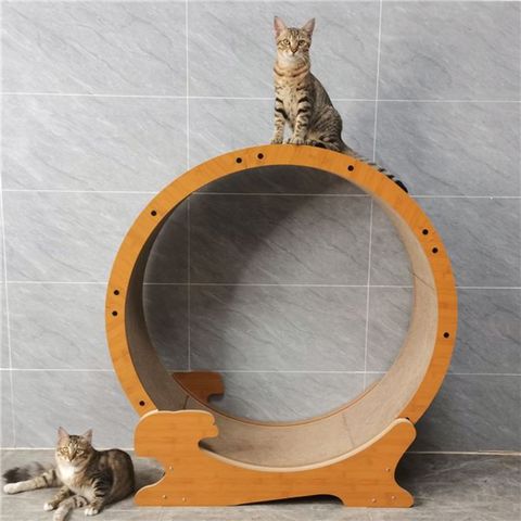 猫ちゃん用のランニングマシン。室内で生活する猫ちゃんの運動不足解消とストレス発散におすすめ。車輪の本体は段ボール製の爪とぎなので、車輪の中と外で爪とぎができます(別売りで替え爪とぎあり)。夜や外出時など必要な時は回らないように固定できるので、キャットタワーがわりにも使えます。幅約100cm、奥行約39cmと広々サイズで大型の猫ちゃんにもおすすめ。回る音が静かなので、集合住宅でも使えます。