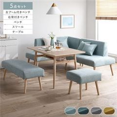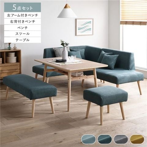 北欧ソファダイニング 5点セット 左カウチスタイル テーブル+右背付ベンチ+左アーム付ベンチ+ベンチ+スツール シーグリーン 組立 【同梱不可】【代引不可】[▲][TP]