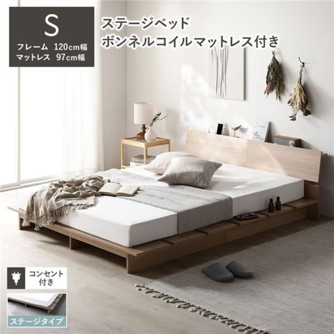 ステージベッド 棚付 ステージタイプ シングル ボンネルコイルマットレス付 ナチュラル フレーム幅120cm マットレス幅97cm 【同梱不可】【代引不可】[▲][TP]