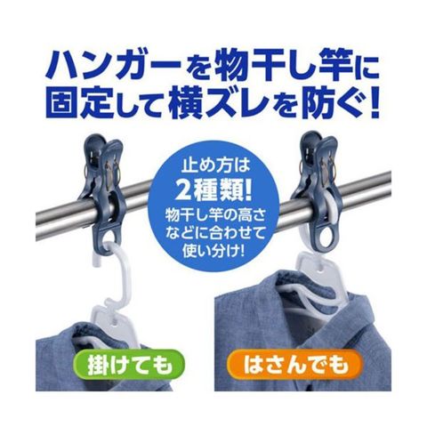 〇高い場所に干す時や風が弱い時は、本品の穴にハンガーを掛けて干すことができ、低い場所に干す時や風が強い時は、上からハンガーをはさんで干すことができます。