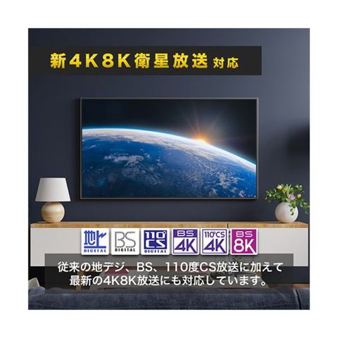 従来の地デジ、BS、110度CS放送に加えて、最新の4K8K放送にも対応しています。