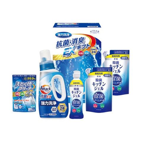 セット内容 : 除菌キッチンジェル詰替用(160ml)×2、花王アタック抗菌EX(750g)・除菌キッチンジェル(200ml)・洗たく槽クリーナーEX(100g)×各1