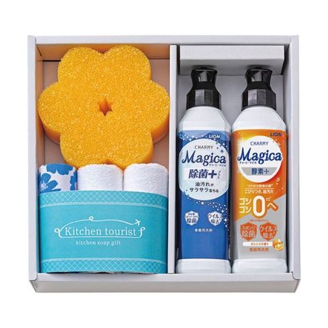 ナノ洗浄でベタつく油汚れもサラサラ落とす食器用洗剤・チャーミーマジカと、今治タオルやマイクロファイバークロスがセットになった、役立つキッチン洗剤ギフトです。かわいらしい花型スポンジとチャーミーマジカで食器洗いを楽しくサポートします。