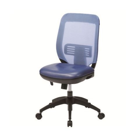背メッシュの通気性とお手入れしやすい座面のPVCレザーが清潔感を保ちやすい事務用チェアFCM‐15シリーズ PVCレザー張りタイプ/ブルー(肘なし)。オプションで固定肘(209‐974)の取り付けが可能です。