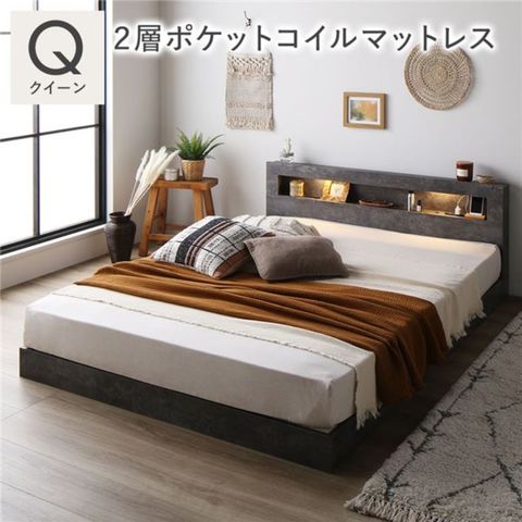 ベッド クイーン 2層ポケットコイルマットレス付 ストーングレー 低床 照明 宮付 すのこ ローベッド 寝具 【同梱不可】【代引不可】[▲][TP]